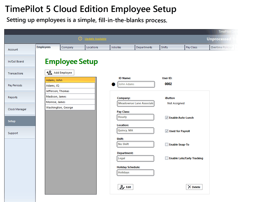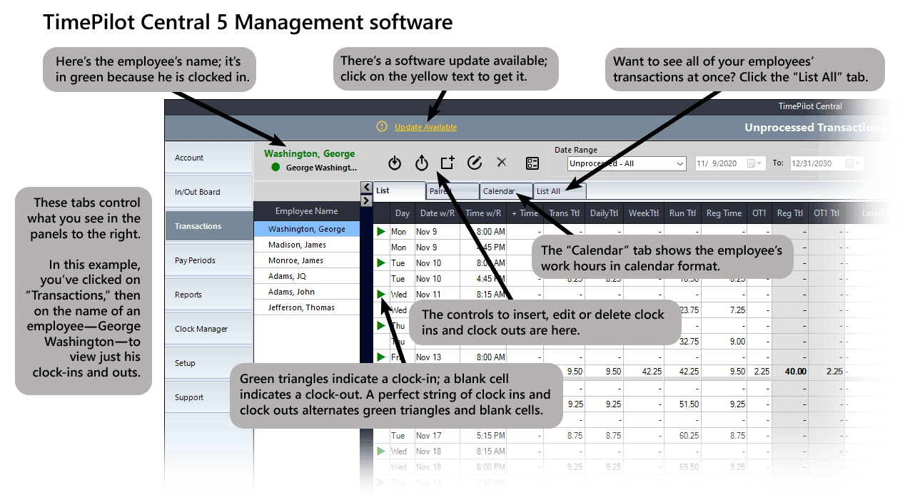 TimePilot Central 5, like earlier versions of the TimePilot software, is where you view the clock-in and clock-out data collected in the database. It's also where you generate reports and prepare the data for payroll. It prepares data in formats appropriate for the top payroll software and services, including QuickBooks and ADP. It's more streamlined than earlier versions and even more user friendly.