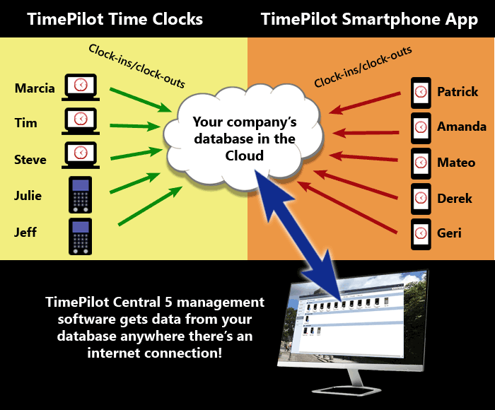 For example, with TimePilot Cloud Edition, if your employees installed TimePilot PC on their home computers in the suburbs and their work computers in the city, and the app on their smartphones, they can clock in or out at home, at the office or on the road, and their data will be stored in a database in the Cloud. A supervisor half a world away can log into that database and see their employees' work hours in real time using the TimePilot Central 5 management software.