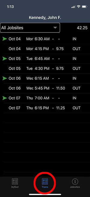 To view an employee's transactions, tap the "Trans" tab at the bottom of the screen on the iPhone and the top of the screen in Android.