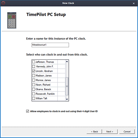 Select the employees who are allowed to clock in and out on this installation of TimePilot PC.