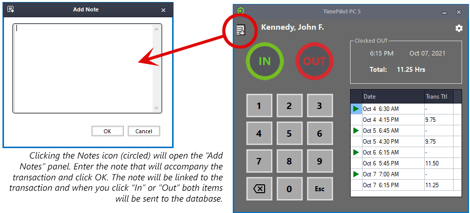 To clock in or out, simply enter the employee's 4-digit ID number. The employee's name will appear along with their transaction history. Click the IN or OUT buttons on the screen to complete the process. The transaction will be recorded and inserted into the TimePilot database.