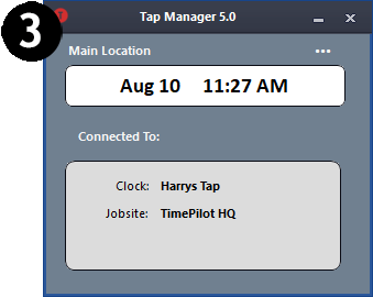 When it's time to do payroll, you'll move those clock-ins and clock-outs from the clock to the TimePilot software. That's done by first starting up the "TimePilot Tap Manager," which is a small software program that acts as the go-between for your Tap clock and your computer. Then you connect the Tap clock to your computer with the included USB cable.