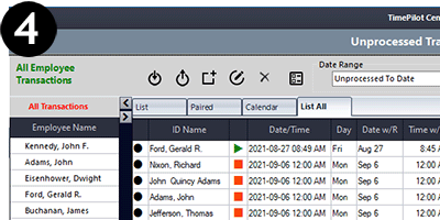 To see the clock-ins and clock-outs (also called "Transactions"), start TimePilot Central. This password-protected software performs all the calculations and lets supervisors correct, insert and delete clock-ins or clock-outs, as well as create reports and prepare the data for payroll.