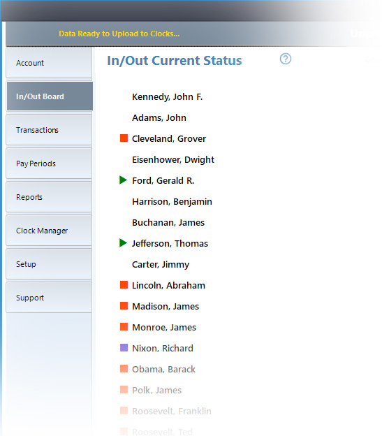 The In/Out Board in the TimePilot 5 software displays the current status of each employee. This feature is especially helpful to organizations that need to know when an employee is on the job and when they're not.