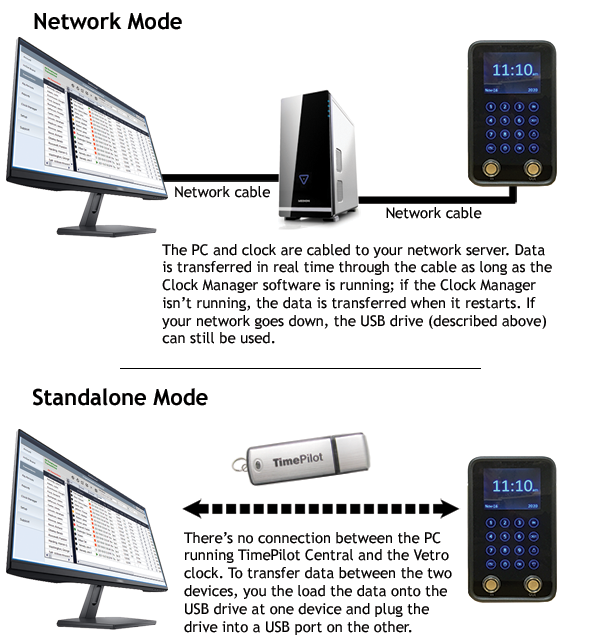 The clocks operate two ways: Network Mode or Standalone Mode.
