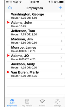 The home screen is shown at right. Each employee’s name is listed, along with his or her regular and overtime hours. Just as in the TimePilot Central software, if there’s a red triangle next to the employee’s name, they are clocked in, and if there's no triangle, that means they're clocked out.
