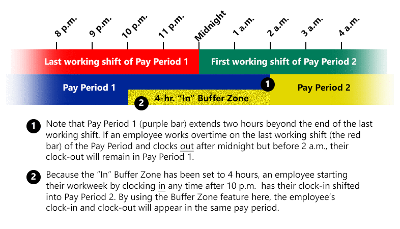 In our example, you’ll set your Pay Period to start at 2 a.m. Sunday and end at 1:59 a.m. the following Sunday. Because the last shift of each Pay Period ends at midnight on Saturday night, employees can clock out almost two hours late and still have their clock-outs show up in the Pay Period.