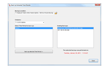 The extracted periods will appear in the left box; click one to highlight it, then click "Back Up Selected Time Period." The backup copy of the extracted pay period will be created, saved to the location you specified at the top of the box and added to the list of backed up pay periods in the box on the right.