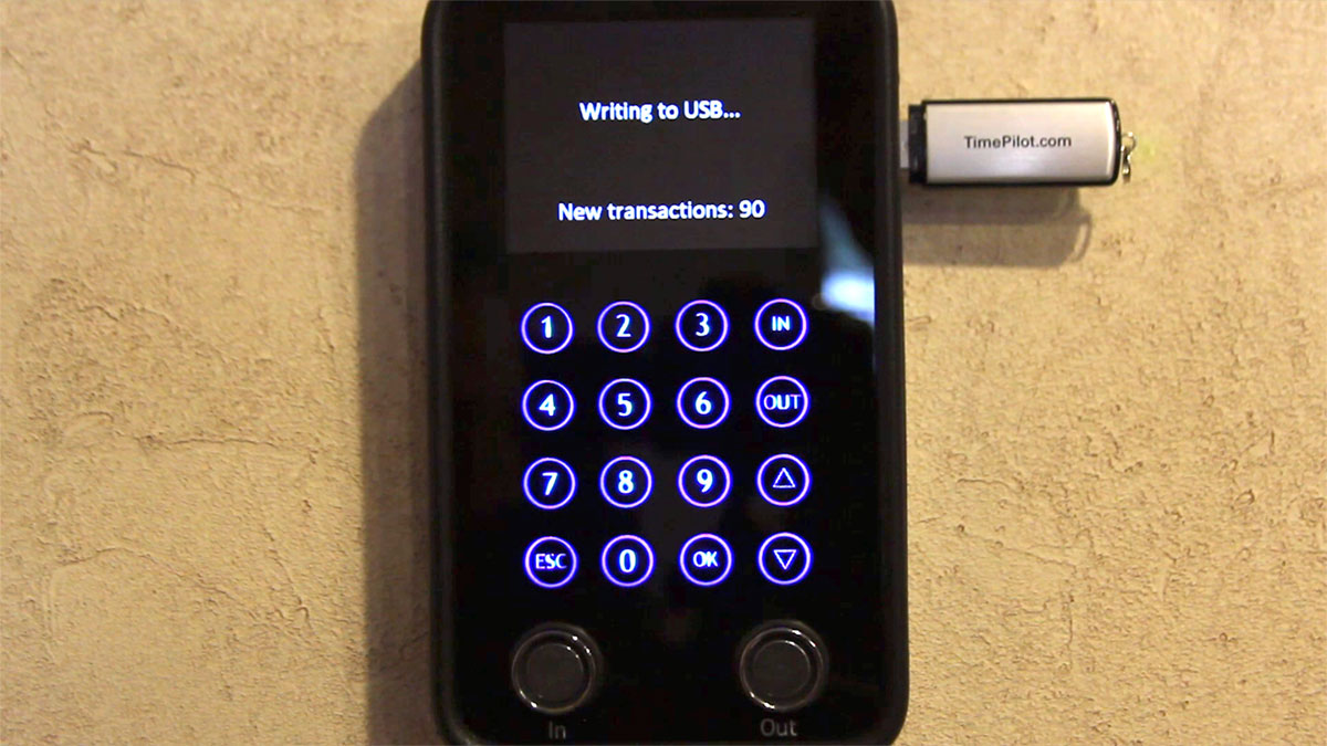 2. When it's time to do payroll, a supervisor plugs the TimePilot USB drive into the port on the side of the clock, enters a password on the keypad and loads the data onto the USB drive.