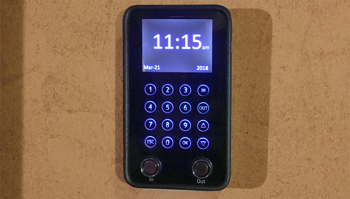 1. Employees clock in and out at the Vetro clock. The clock holds data in memory (it can hold as many as 12,000 clock-ins and clock-outs!). By the way, power outages don't affect the system's memory.