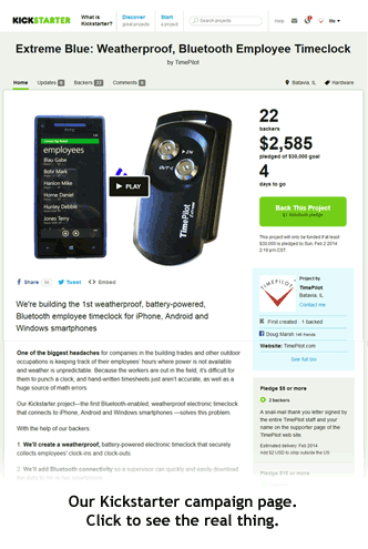 Extreme Blue will be a new rugged, weatherproof, battery-powered timeclock based on our current TimePilot Extreme. Instead of downloading your data to a USB drive and bringing it back to the PC, you’ll be able to collect the data from the clock wirelessly—via Bluetooth—with your iPhone, Android or Windows smartphone. From there you’ll be able to process your data on your phone or send the data to your headquarters via the Internet. Money raised by our Kickstarter campaign will be used to accelerate development of the system.